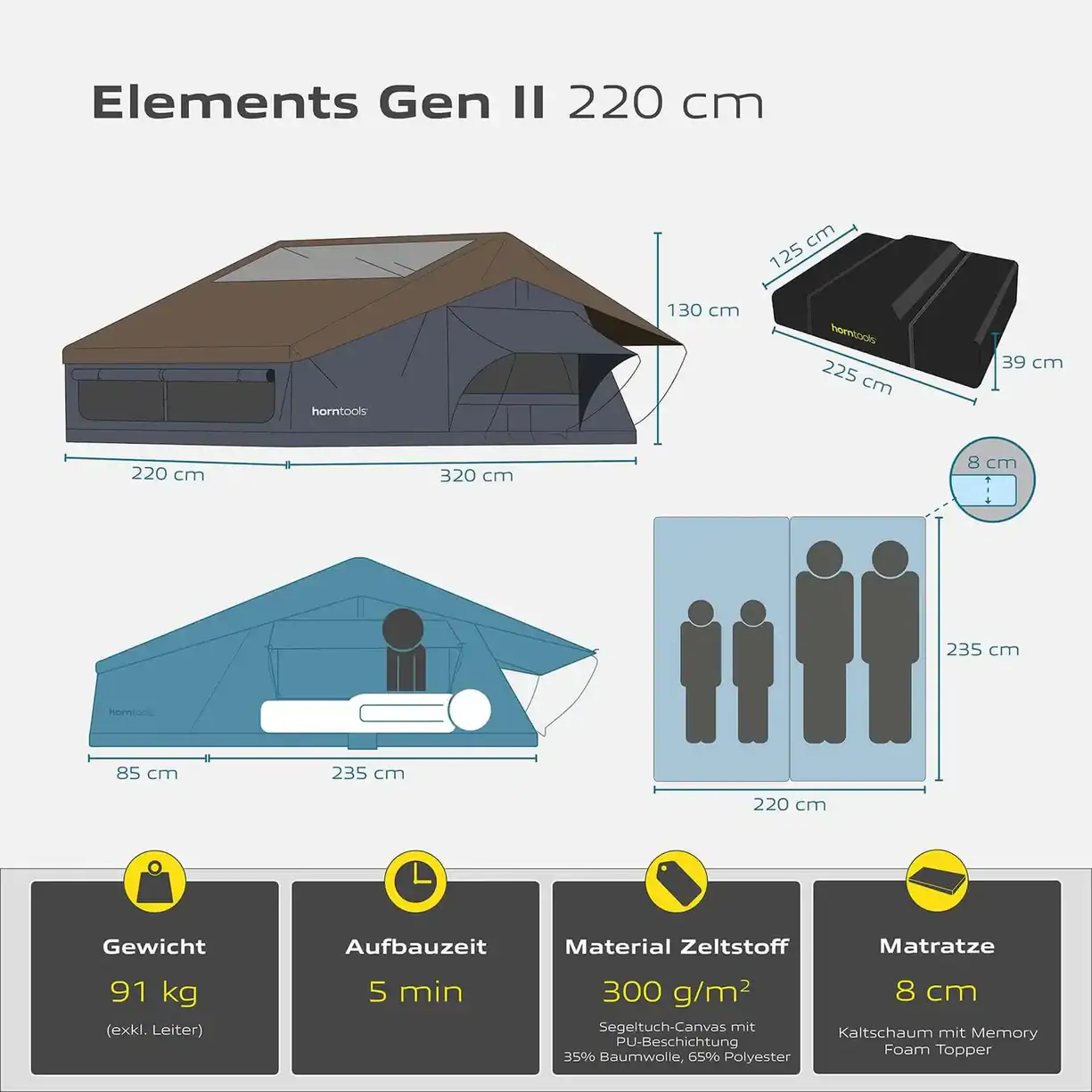 Das Dachzelt Elements nutzt ein robustes Segeltuch-Canvas (300g/mÂČ) mit einer PU-Beschichtung, das dich effektiv vor Regen schĂŒtzt (WassersĂ€ule Zeltstoff: 2000 mm, Fly Sheet: 3000 mm). Die Farben Navy Blue und Braun fĂŒr das Fly Sheet sind nicht nur praktisch, sondern fĂŒgen sich auch harmonisch in jede Naturlandschaft ein. Das Zelt bietet zudem eine komfortable 8 cm dicke Kaltschaummatratze, auf der du dich nach einem ereignisreichen Tag entspannen kannst.